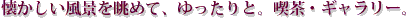 縁側から広がる美山の風景。懐かしい畳や家具の空間。 美山の風景にとけこむスイーツや作家作品。 かやぶき交流館は、日常を忘れてゆったりと過ごして頂ける カフェ・ギャラリー「彩花」としてオープンしております。 カフェスペースでは、地元食材を使い季節をテーマにした 手作りのスイーツをお楽しみいただけます。 | | |
